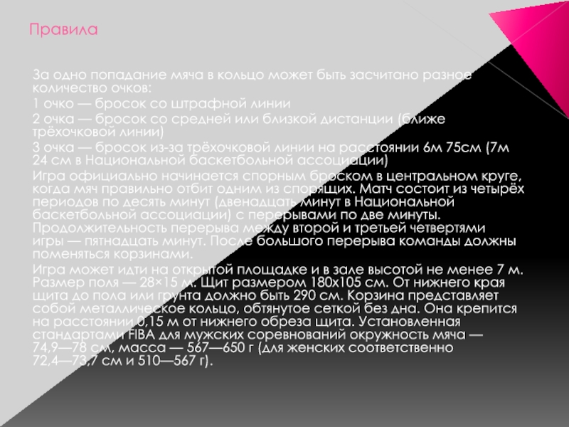команды, каждая из которых состоит из пяти игроков. Цель каждой команды — забросить руками мяч в кольцо с сеткой (корзину) соперника и помешать другой команде овладеть мячом и забросить его в свою корзину. Корзина находится на высоте 3,05 метра от пола. От каждой команды на площадке находится по 5 человек, всего в команде 12 человек, замены не ограничены. За мяч, заброшенный с ближней и средней дистанции, засчитывается 2 очка, с дальней (из-за трёхочковой линии) — 3 очка. Штрафной бросок оценивается в одно очко. Стандартный размер баскетбольной площадки 28 метров в длину и 15 метров в ширину. Баскетбол — один из самых популярных видов спорта в мире.
