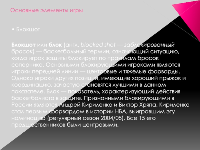 защиты блокирует по правилам бросок соперника. Основными блокирующими игроками являются игроки передней линии — центровые и тяжелые форварды. Однако игроки других позиций, имеющие хороший прыжок и координацию, зачастую становятся лучшими в данном показателе. Блок — показатель, характеризующий действия баскетболиста в защите. Признанными блокирующими в России являются Андрей Кириленко и Виктор Хряпа. Кириленко стал первым форвардом в истории НБА, выигравшим эту номинацию (регулярный сезон 2004/05). Все 15 его предшественников были центровыми.