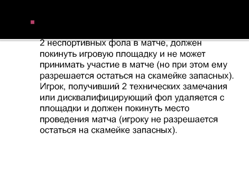НБА) или 2 неспортивных фола в матче, должен покинуть игровую площадку и не может принимать участие в матче (но при этом ему разрешается остаться на скамейке запасных). Игрок, получивший 2 технических замечания или дисквалифицирующий фол удаляется с площадки и должен покинуть место проведения матча (игроку не разрешается остаться на скамейке запасных).