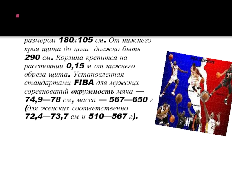 менее 7 м. Размер поля — 28×15 м. Щит размером 180х105 см. От нижнего края щита до пола должно быть 290 см. Корзина крепится на расстоянии 0,15 м от нижнего обреза щита. Установленная стандартами FIBA для мужских соревнований окружность мяча — 74,9—78 см, масса — 567—650 г (для женских соответственно 72,4—73,7 см и 510—567 г).