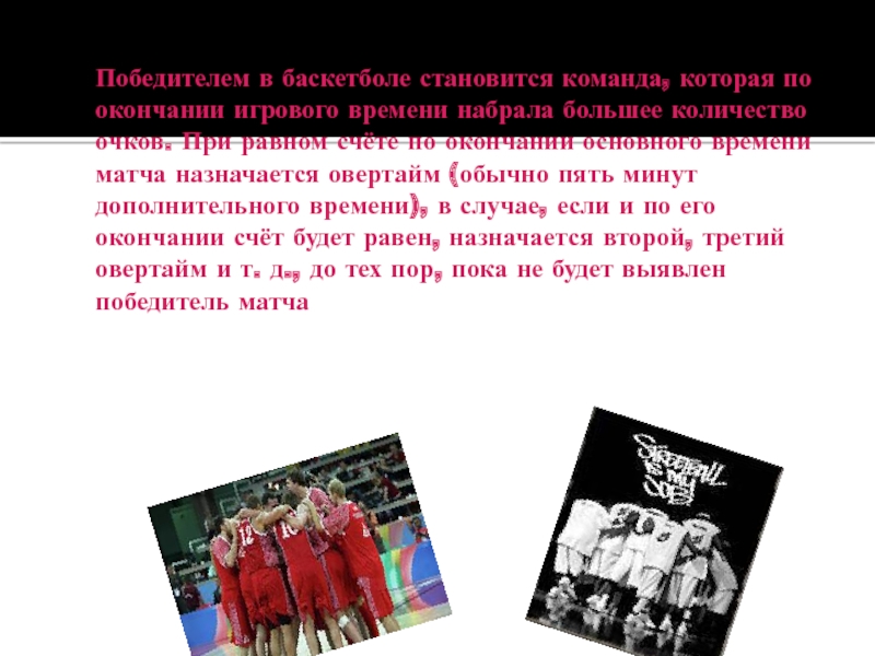Слайд 9Победителем в баскетболе становится команда, которая по окончании игрового времени набрала
