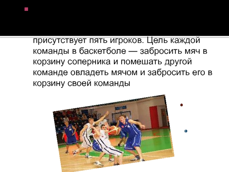 из которых на площадке одновременно присутствует пять игроков. Цель каждой команды в баскетболе — забросить мяч в корзину соперника и помешать другой команде овладеть мячом и забросить его в корзину своей команды