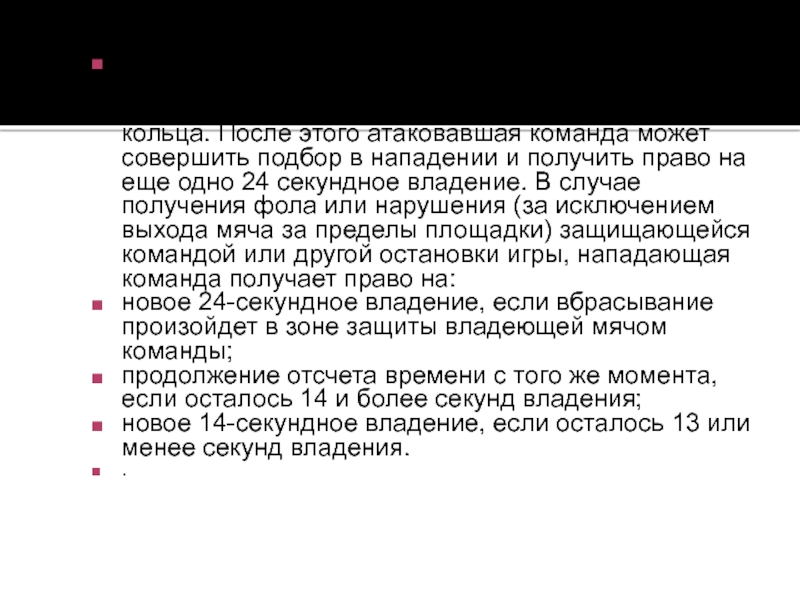 произвела броска по кольцу. Счётчик 24 секунд сбрасывается, если мяч коснется дужки кольца. После этого атаковавшая команда может совершить подбор в нападении и получить право на еще одно 24 секундное владение. В случае получения фола или нарушения (за исключением выхода мяча за пределы площадки) защищающейся командой или другой остановки игры, нападающая команда получает право на: