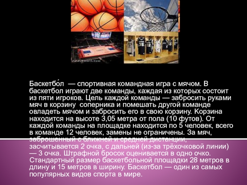 Слайд 2Баскетбо́л — спортивная командная игра с мячом. В баскетбол играют две