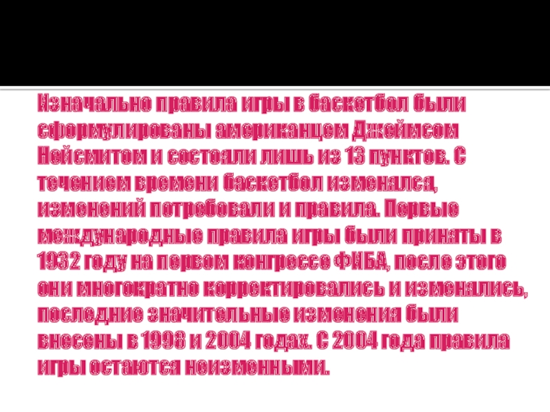 состояли лишь из 13 пунктов. С течением времени баскетбол изменялся, изменений потребовали и правила. Первые международные правила игры были приняты в 1932 году на первом конгрессе ФИБА, после этого они многократно корректировались и изменялись, последние значительные изменения были внесены в 1998 и 2004 годах. С 2004 года правила игры остаются неизменными.