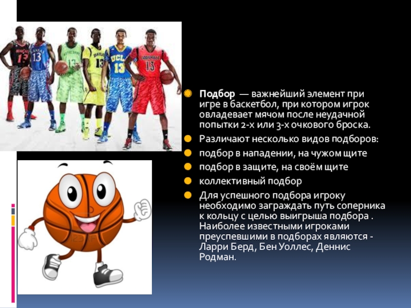 Слайд 16Подбор — важнейший элемент при игре в баскетбол, при котором игрок