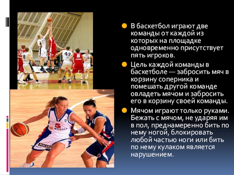 Цель каждой команды в баскетболе — забросить мяч в корзину соперника и помешать другой команде овладеть мячом и забросить его в корзину своей команды.