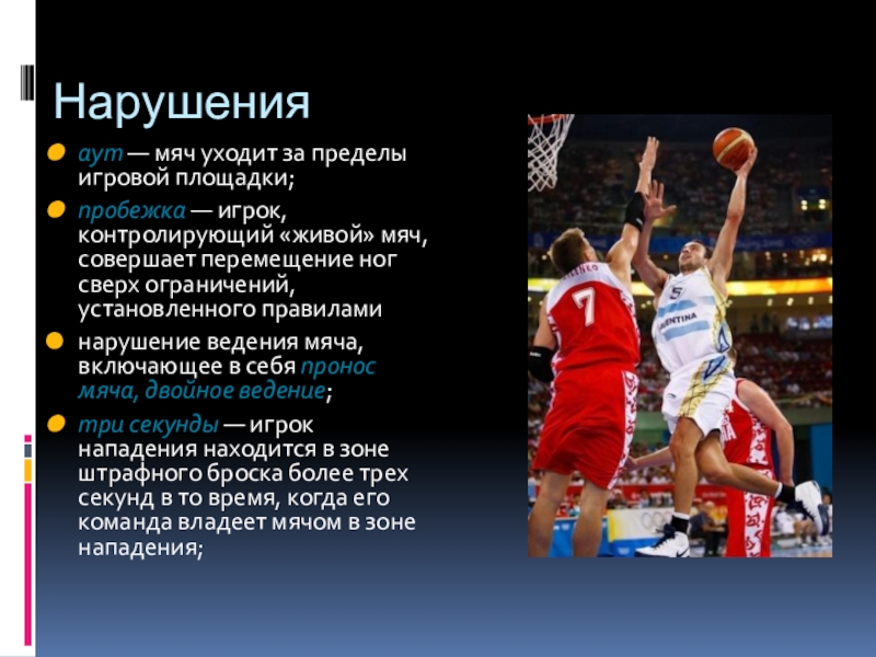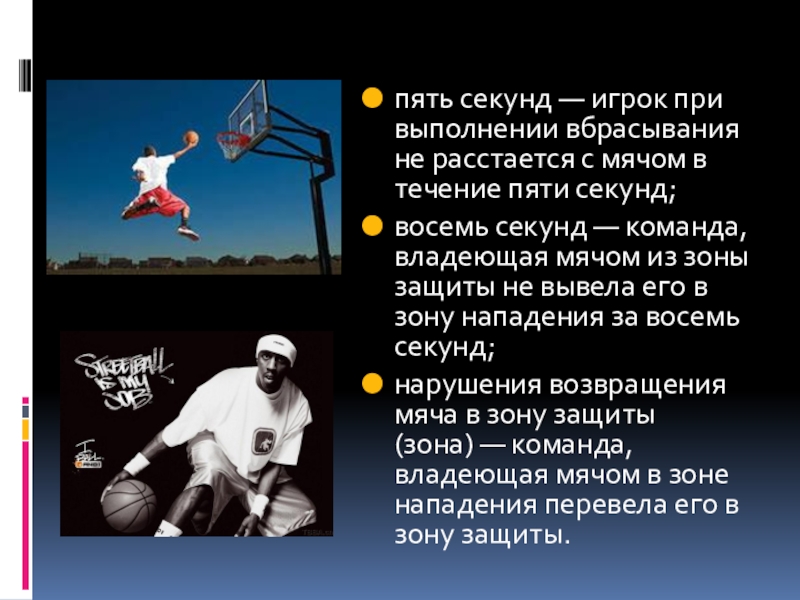 Слайд 12пять секунд — игрок при выполнении вбрасывания не расстается с мячом в