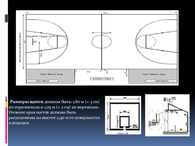Размеры щитов должны быть: 1,80 м (+ 3 см) по горизонтали и 1,05 м (+ 2 см) по вертикали. Нижние края щитов должны быть расположены на высоте 2,90 м от поверхности площадки.