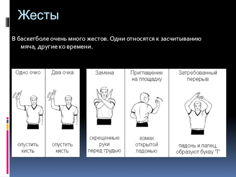 В баскетболе очень много жестов. Одни относятся к засчитыванию мяча, другие