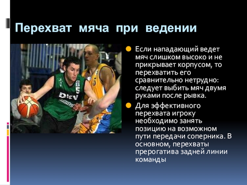 Выбивание мяча при ведении: Защитник набирает такую же скорость как и нападающий, и опередив ритм ведения выбивает мяч ближайшей к сопернику рукой в момент приема мяча, отскочившего от площадки.
