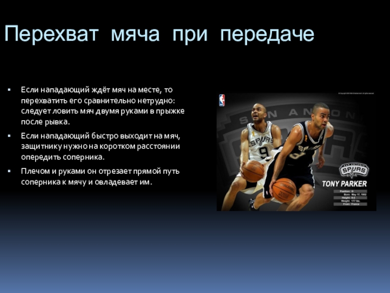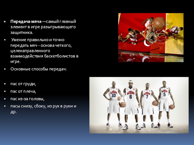 Слайд 15Передача мяча —самый главный элемент в игре разыгрывающего защитника.