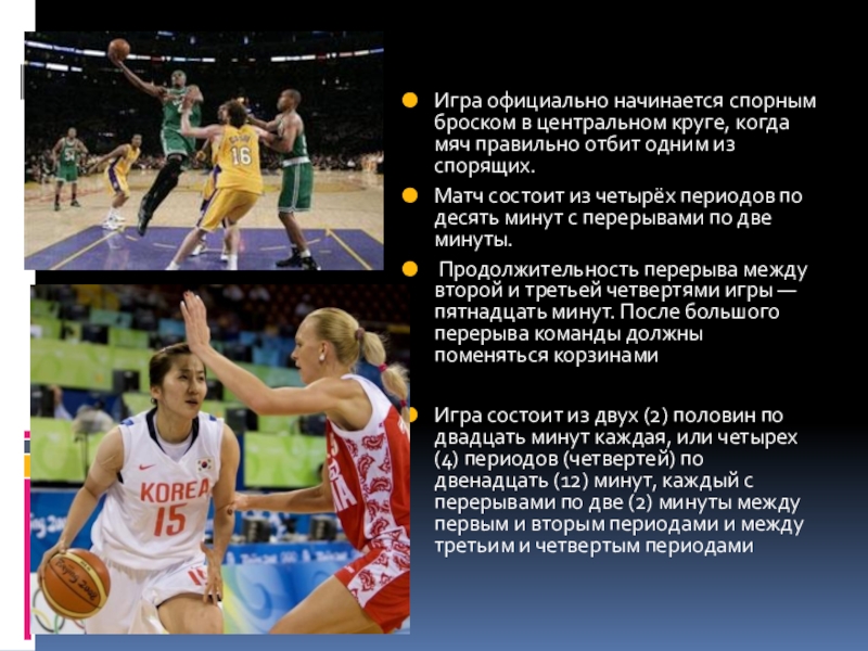 Слайд 10Игра официально начинается спорным броском в центральном круге, когда мяч правильно