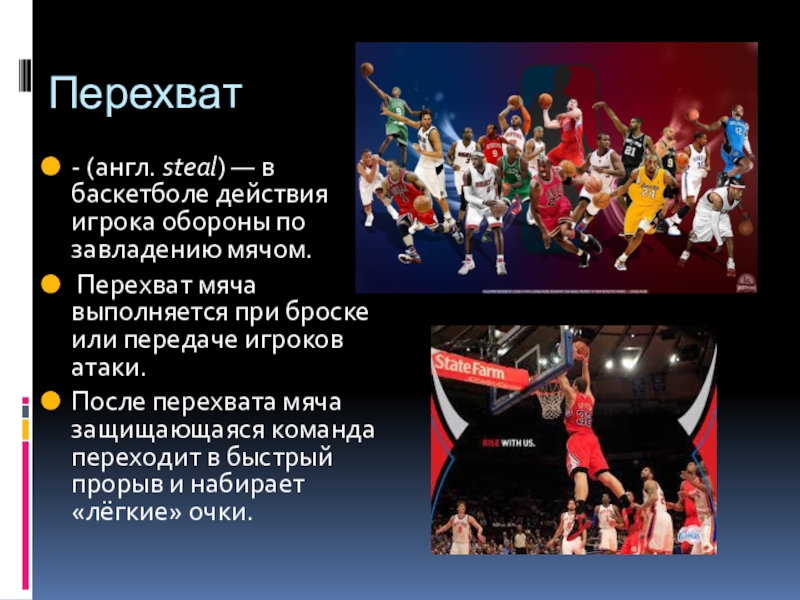 - (англ. steal) — в баскетболе действия игрока обороны по завладению мячом.