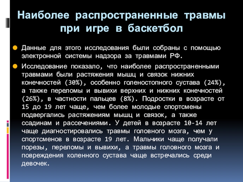 Слайд 24Наиболее распространенные травмы при игре в баскетбол