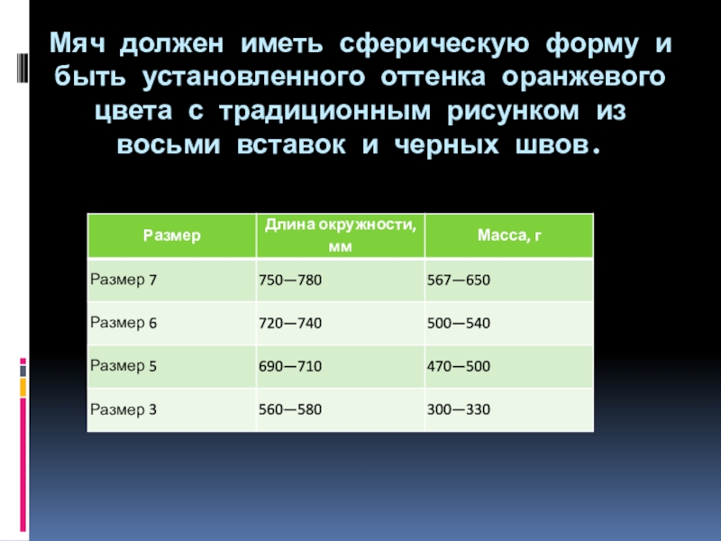 Слайд 23Мяч должен иметь сферическую форму и быть установленного оттенка оранжевого цвета