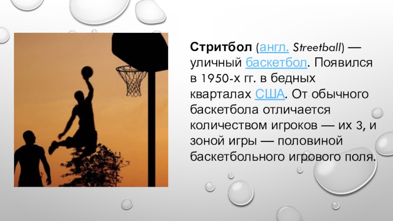 Слайд 13Стритбол (англ. Streetball) — уличный баскетбол. Появился в 1950-х гг. в бедных кварталах