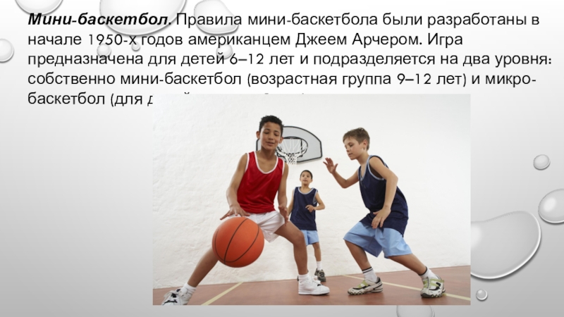 Слайд 11Мини-баскетбол. Правила мини-баскетбола были разработаны в начале 1950-х годов американцем Джеем