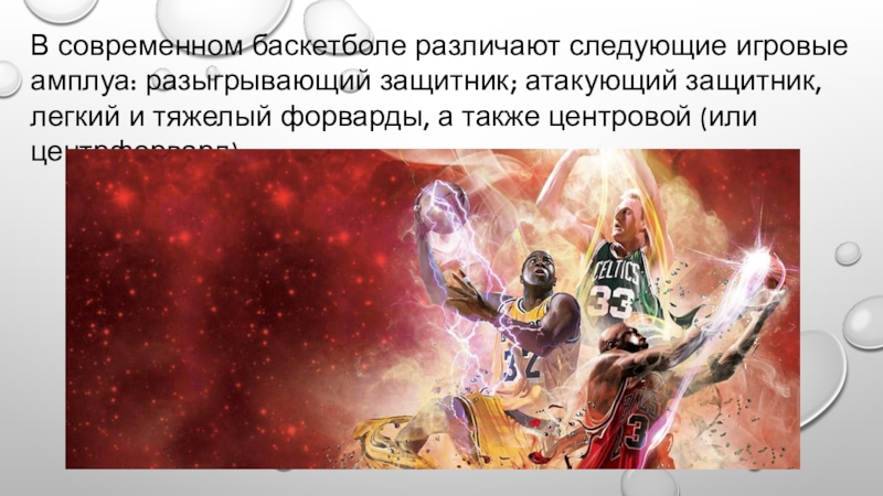 В современном баскетболе различают следующие игровые амплуа: разыгрывающий защитник; атакующий защитник, легкий и тяжелый форварды, а также