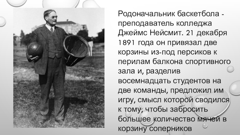 Слайд 2Родоначальник баскетбола - преподаватель колледжа Джеймс Нейсмит. 21 декабря 1891 года