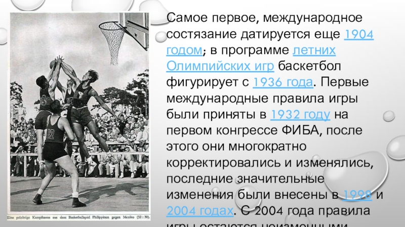 Самое первое, международное состязание датируется еще 1904 годом; в программе летних Олимпийских игр баскетбол фигурирует с 1936