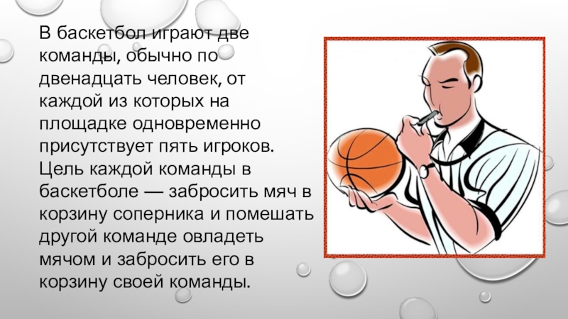 Слайд 5В баскетбол играют две команды, обычно по двенадцать человек, от каждой