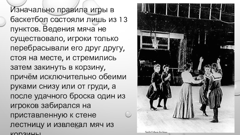 Слайд 3Изначально правила игры в баскетбол состояли лишь из 13 пунктов. Ведения