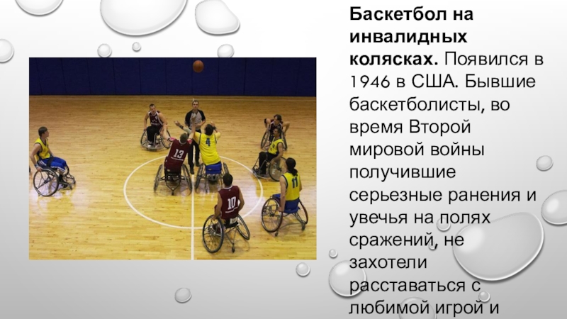 Слайд 10Баскетбол на инвалидных колясках. Появился в 1946 в США. Бывшие баскетболисты,