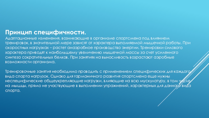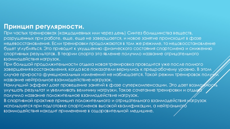 адаптации к воздействию физических нагрузок в процессе тренировки. Для практики спорта эти закономерности формулируют как биологические принципы спортивной тренировки.