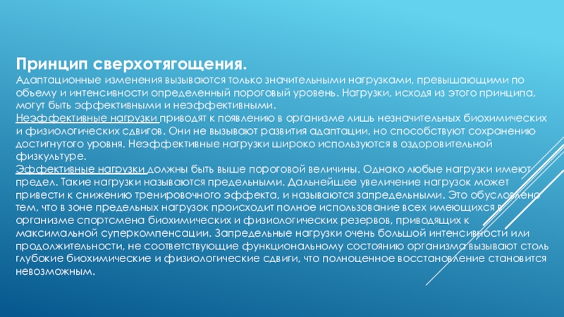 Эффективные нагрузки должны быть выше пороговой величины. Однако любые нагрузки имеют предел. Такие нагрузки называются предельными. Дальнейшее увеличение нагрузок может привести к снижению тренировочного эффекта, и называются запредельными. Это обусловлено тем, что в зоне предельных нагрузок происходит полное использование всех имеющихся в организме спортсмена биохимических и физиологических резервов, приводящих к максимальной суперкомпенсации. Запредельные нагрузки очень большой интенсивности или продолжительности, не соответствующие функциональному состоянию организма вызывают столь глубокие биохимические и физиологические сдвиги, что полноценное восстановление становится невозможным.