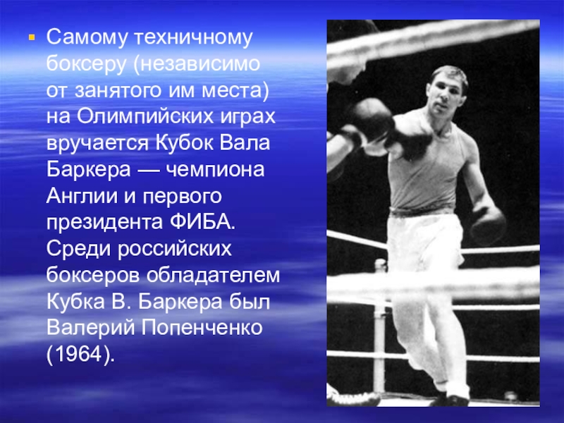вручается Кубок Вала Баркера — чемпиона Англии и первого президента ФИБА. Среди российских боксеров обладателем Кубка В. Баркера был Валерий Попенченко (1964).
