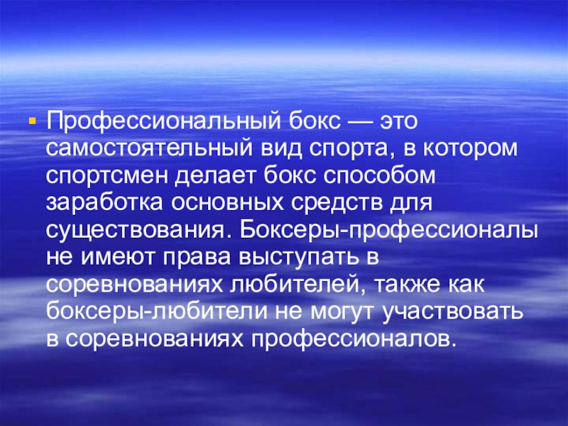 Слайд 13Профессиональный бокс — это самостоятельный вид спорта, в котором спортсмен делает