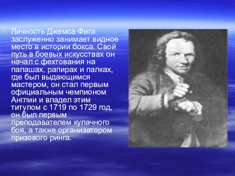 Слайд 6Личность Джемса Фига заслуженно занимает видное место в истории бокса. Свой