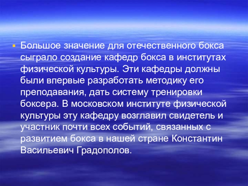 Слайд 10Большое значение для отечественного бокса сыграло создание кафедр бокса в институтах