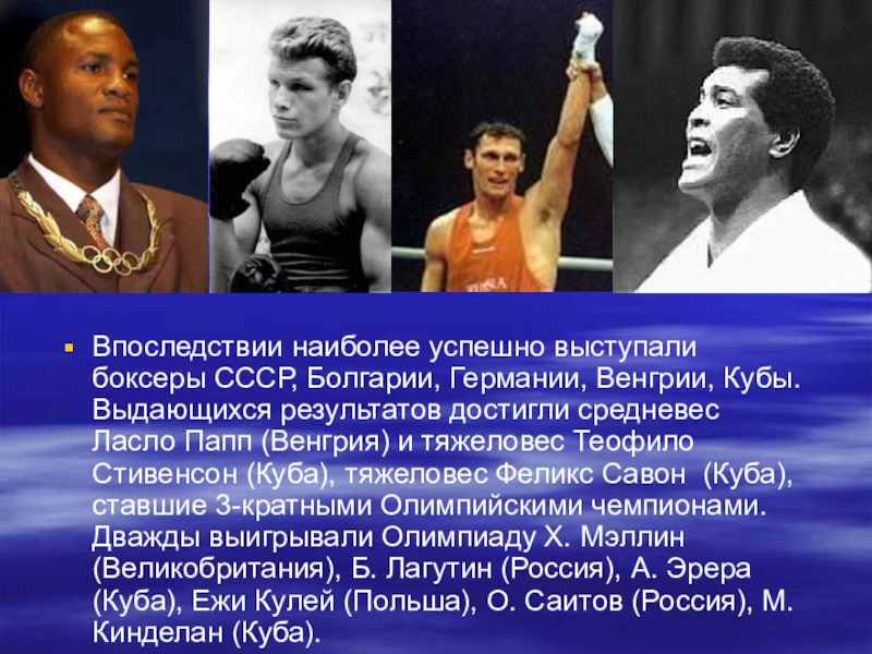 Слайд 11Впоследствии наиболее успешно выступали боксеры СССР, Болгарии, Германии, Венгрии, Кубы. Выдающихся