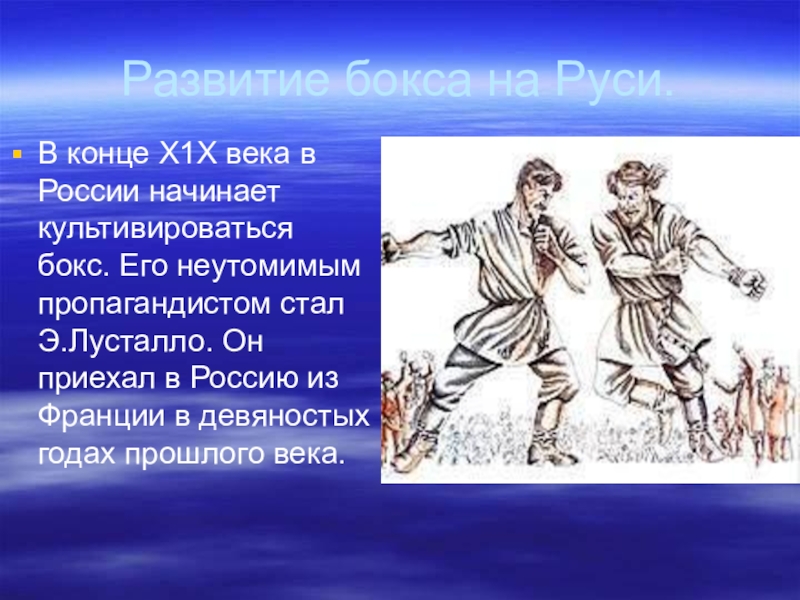 бокс. Его неутомимым пропагандистом стал Э.Лусталло. Он приехал в Россию из Франции в девяностых годах прошлого века.