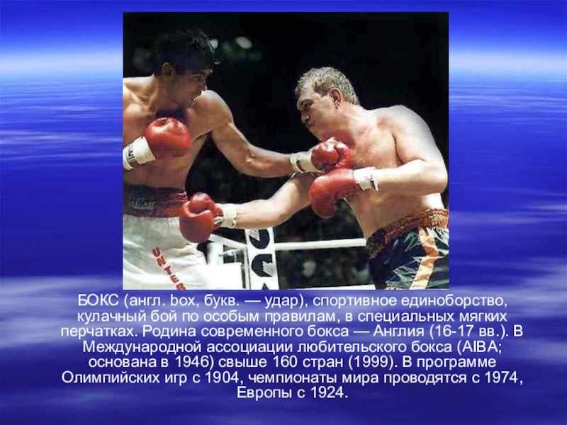 особым правилам, в специальных мягких перчатках. Родина современного бокса — Англия (16-17 вв.). В Международной ассоциации любительского бокса (AIBA; основана в 1946) свыше 160 стран (1999). В программе Олимпийских игр с 1904, чемпионаты мира проводятся с 1974, Европы с 1924.