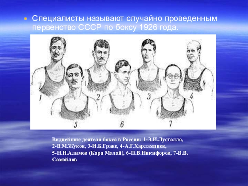 Слайд 9Специалисты называют случайно проведенным первенство СССР по боксу 1926 года.