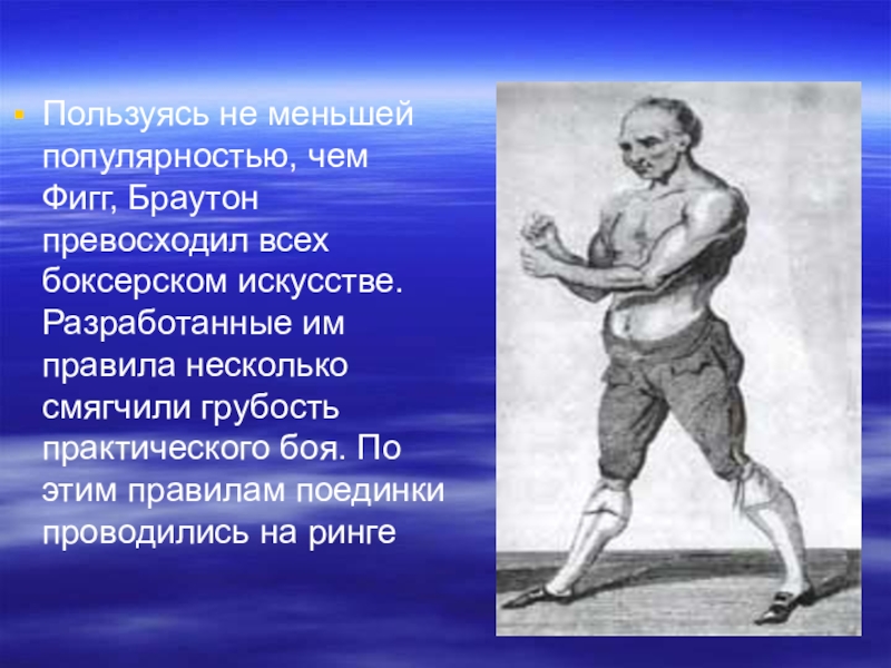 Слайд 7Пользуясь не меньшей популярностью, чем Фигг, Браутон превосходил всех боксерском искусстве.