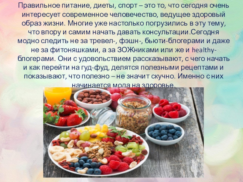 Слайд 6Правильное питание, диеты, спорт – это то, что сегодня очень интересует