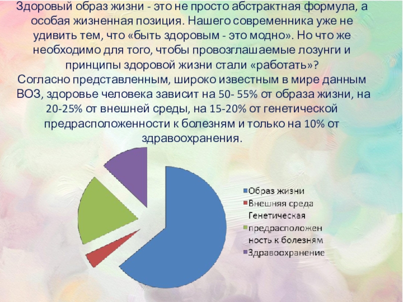 жизненная позиция. Нашего современника уже не удивить тем, что «быть здоровым - это модно». Но что же необходимо для того, чтобы провозглашаемые лозунги и принципы здоровой жизни стали «работать»? Согласно представленным, широко известным в мире данным ВОЗ, здоровье человека зависит на 50- 55% от образа жизни, на 20-25% от внешней среды, на 15-20% от генетической предрасположенности к болезням и только на 10% от здравоохранения.