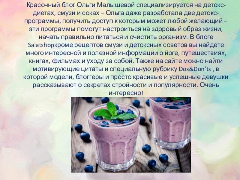 Слайд 8SALATSHOP Красочный блог Ольги Малышевой специализируется на детокс-диетах, смузи и соках –