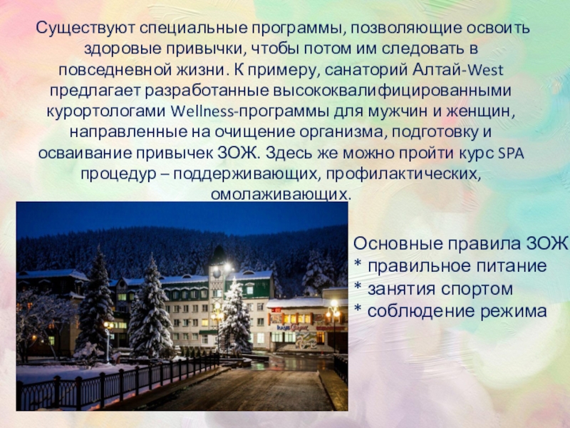 следовать в повседневной жизни. К примеру, санаторий Алтай-West предлагает разработанные высококвалифицированными курортологами Wellness-программы для мужчин и женщин, направленные на очищение организма, подготовку и осваивание привычек ЗОЖ. Здесь же можно пройти курс SPA процедур – поддерживающих, профилактических, омолаживающих.