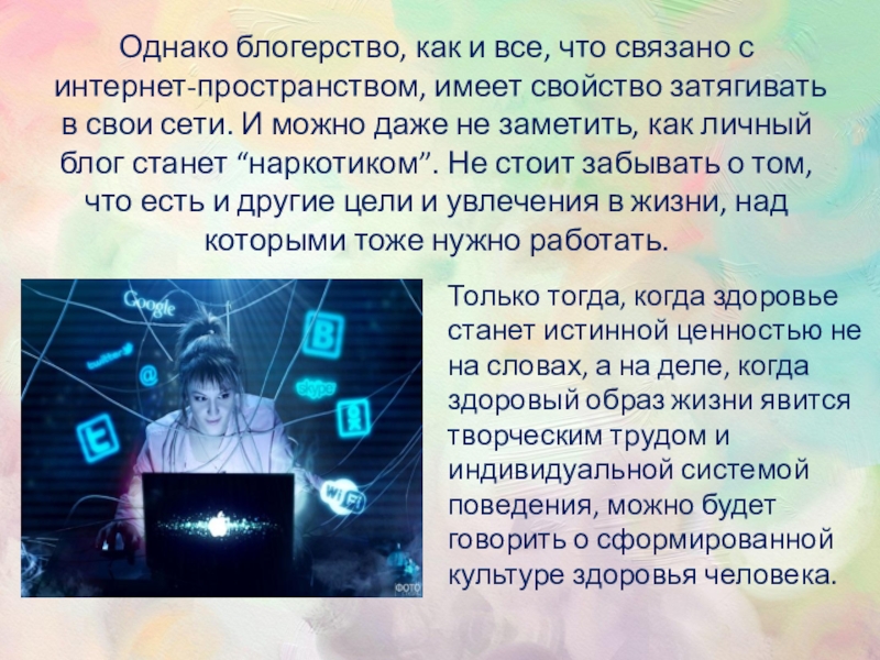 затягивать в свои сети. И можно даже не заметить, как личный блог станет “наркотиком”. Не стоит забывать о том, что есть и другие цели и увлечения в жизни, над которыми тоже нужно работать.
