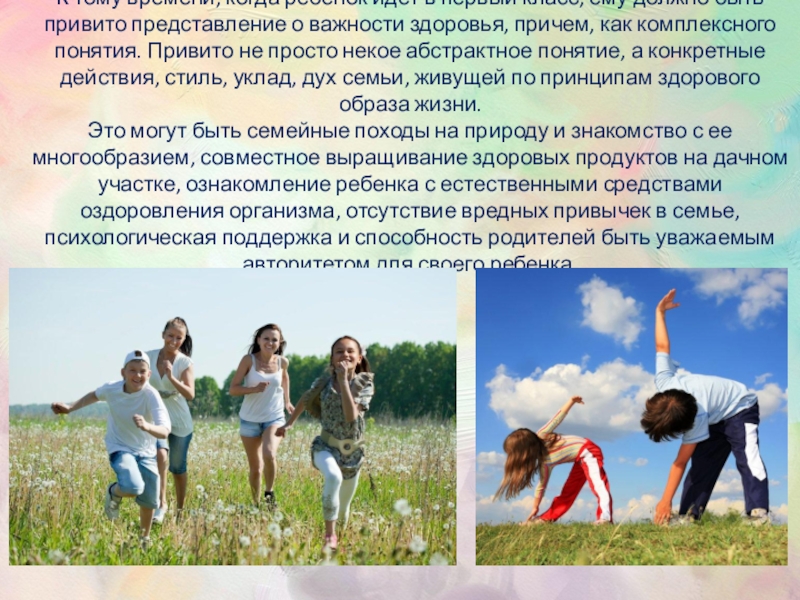быть привито представление о важности здоровья, причем, как комплексного понятия. Привито не просто некое абстрактное понятие, а конкретные действия, стиль, уклад, дух семьи, живущей по принципам здорового образа жизни. Это могут быть семейные походы на природу и знакомство с ее многообразием, совместное выращивание здоровых продуктов на дачном участке, ознакомление ребенка с естественными средствами оздоровления организма, отсутствие вредных привычек в семье, психологическая поддержка и способность родителей быть уважаемым авторитетом для своего ребенка.