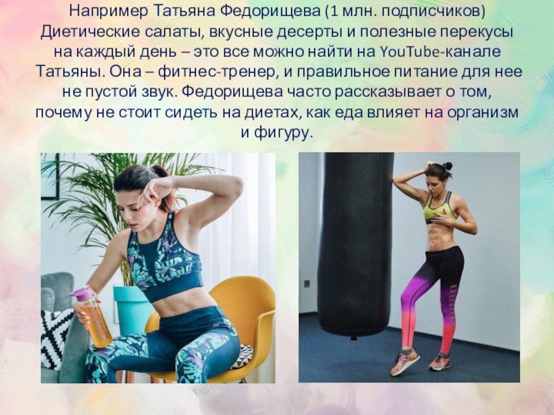 Слайд 7Например Татьяна Федорищева (1 млн. подписчиков) Диетические салаты, вкусные десерты и полезные