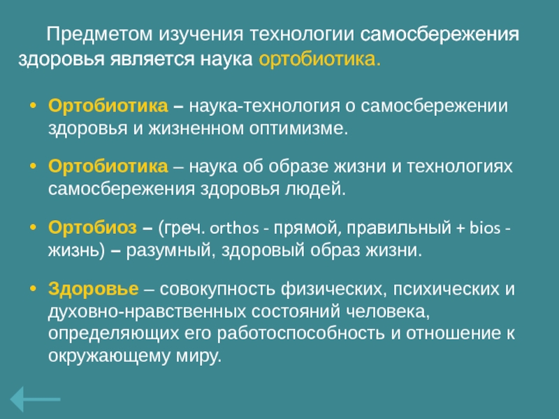 Предметом изучения технологии самосбережения здоровья является наука ортобиотика.