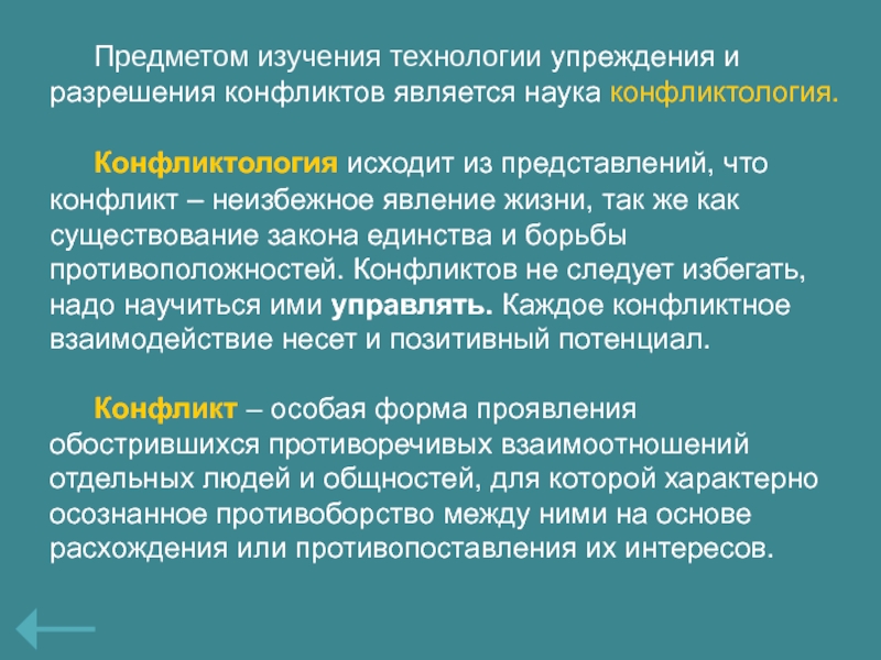 Предметом изучения технологии упреждения и разрешения конфликтов является наука конфликтология.