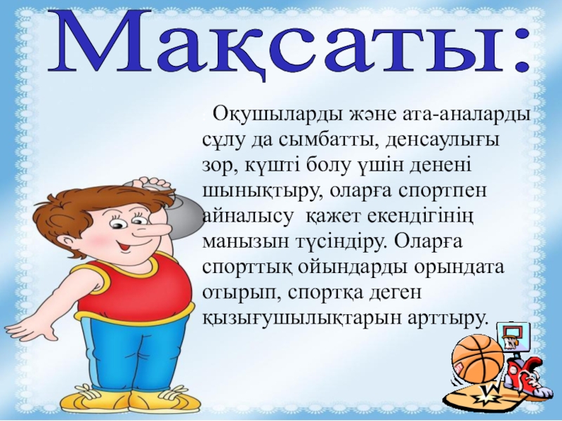 үшін денені шынықтыру, оларға спортпен айналысу қажет екендігінің манызын түсіндіру. Оларға спорттық ойындарды орындата отырып, спортқа деген қызығушылықтарын арттыру.