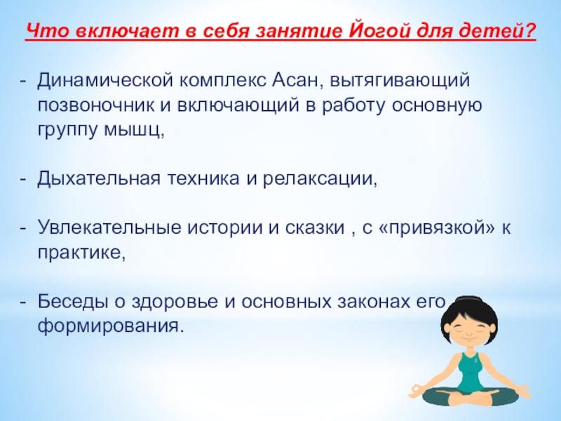 Слайд 6Что включает в себя занятие Йогой для детей?